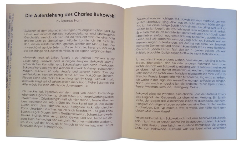 Mit Beiträgen von Jörg Fauser, Dan Fante, Charles Bukowski, Eric Robert Nolan, Benno Käsmäyr, David S. Willis, Ring King u.a., und Terence Horn.