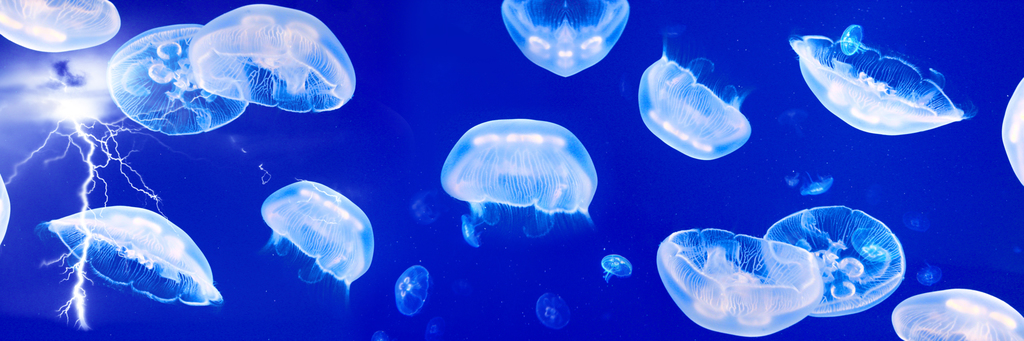 Quallen im blauen Meer und Lesestoff